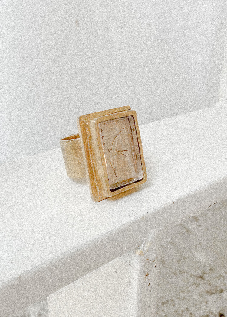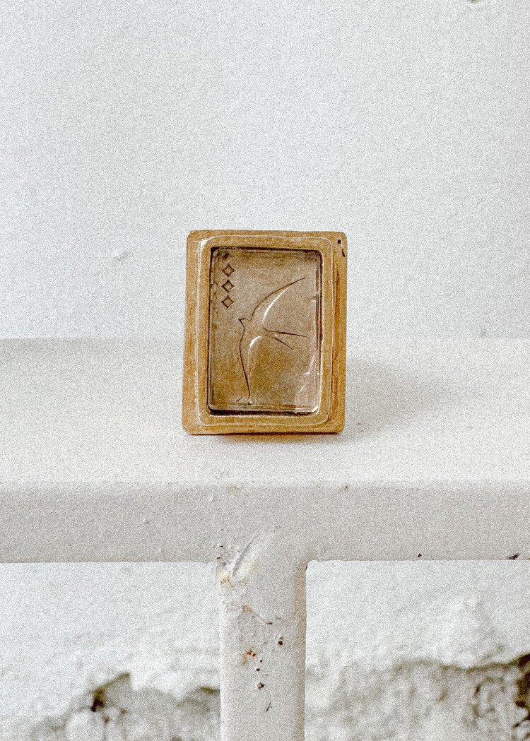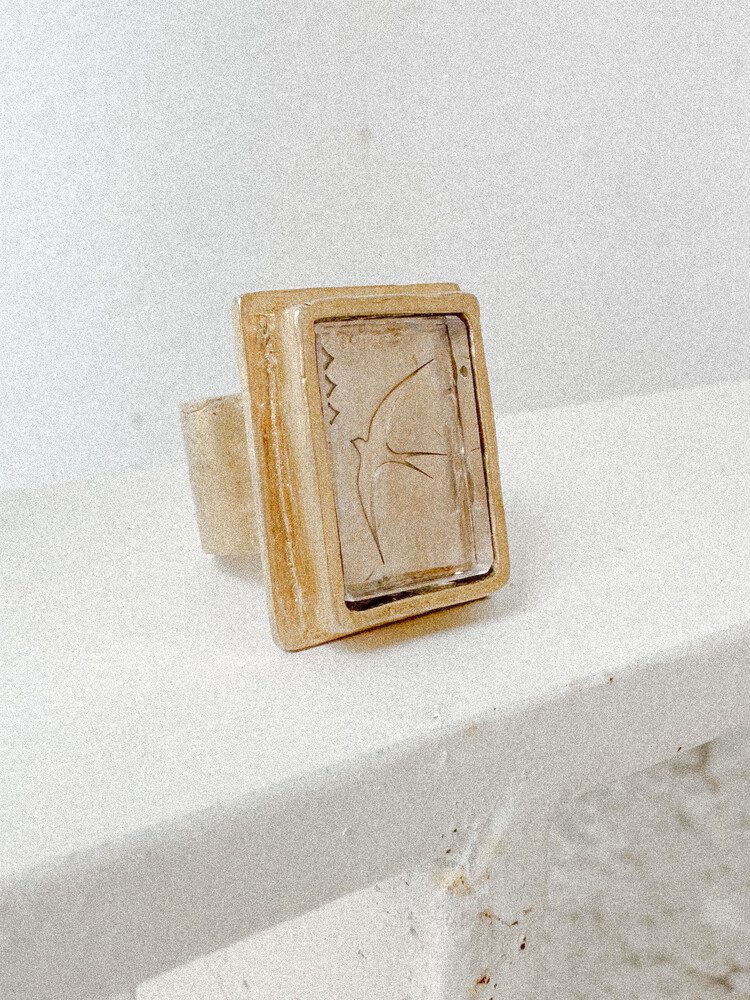 Land of Bird 반지는 손으로 조각 되었으며 커팅된 투명한 백수정 조각이 반지 중앙에 세팅되어 있습니다. 3개의 작은 다이아몬드 모양과 새 모양이 새겨져 있습니다. (실버 선택 가능)